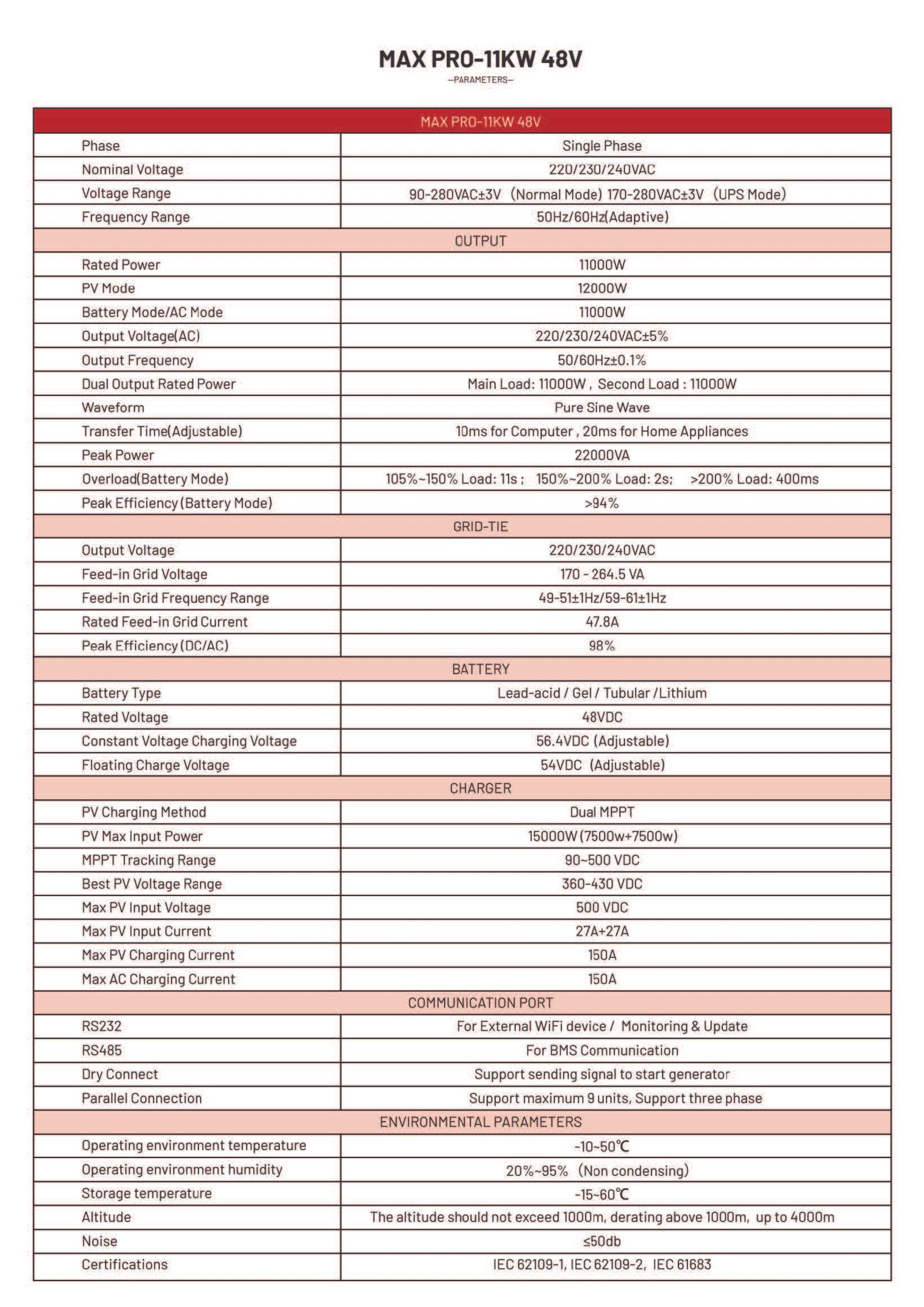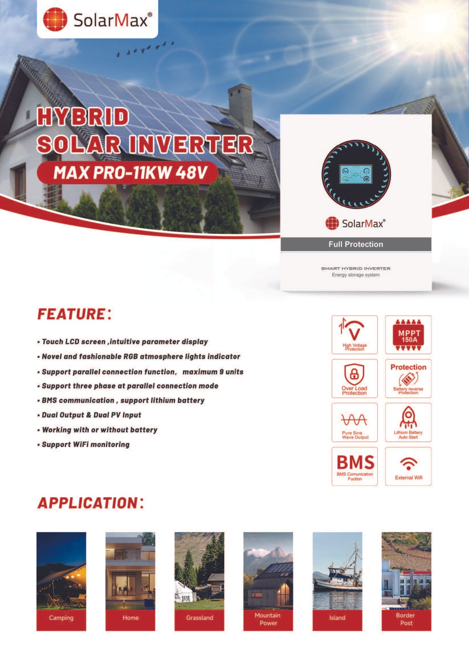 The SolarMax TF Hybrid Inverter 11KW delivers 11,000W of reliable pure sinewave output for residential and commercial systems